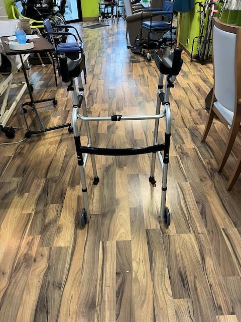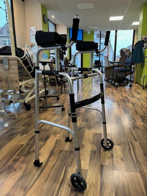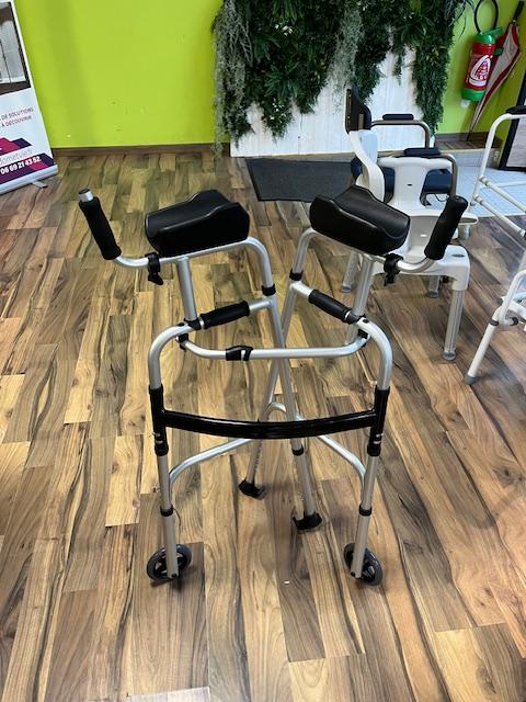 "Ce cadre de marche pliant dispose de 2 roulettes à l’avant 12,5 cm et de patins glissants à l’arrière pour une déambulation linéaire mais lente.